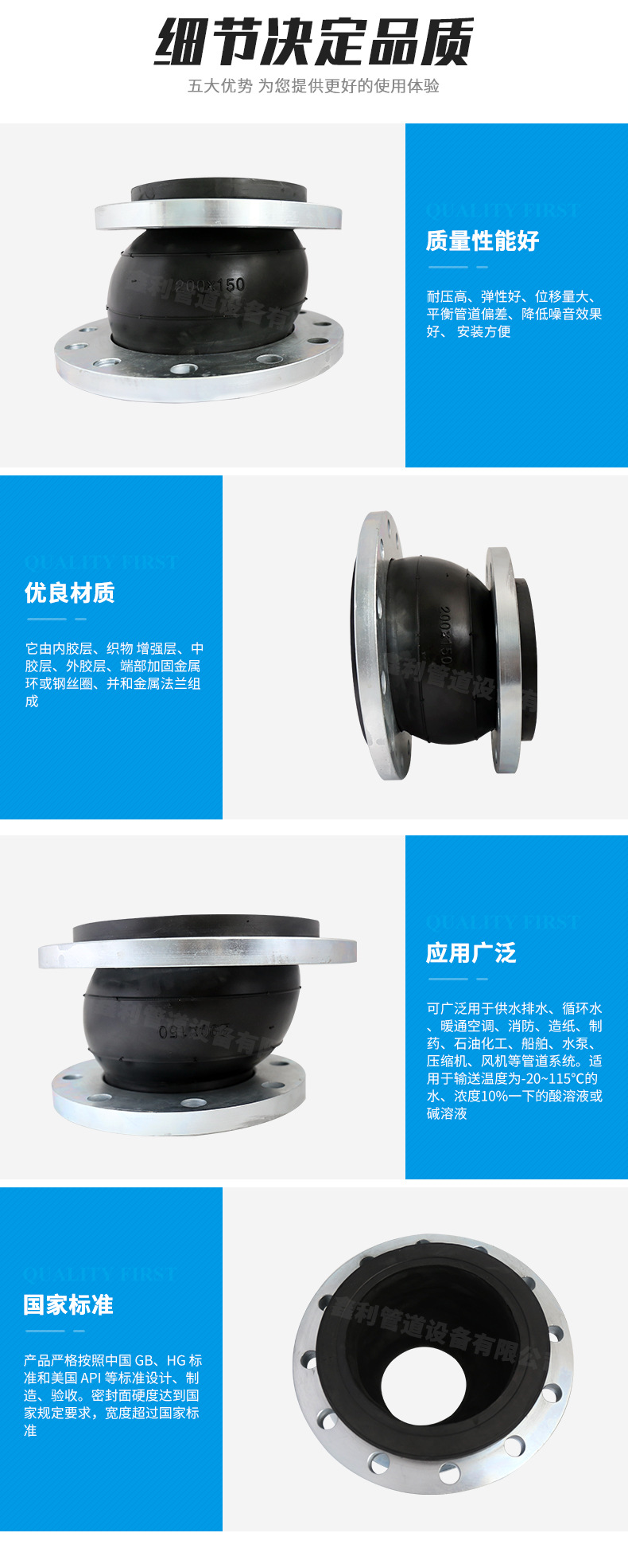 鑫利管道設備有限公司是生產(chǎn)各種橡膠接頭的生產(chǎn)廠家,。主要產(chǎn)品有橡膠管接頭橡膠軟接頭、可曲撓橡膠接頭、單球體橡膠接頭、雙球體橡膠接頭異徑橡膠接頭、卡箍橡膠接頭絲扣橡膠接頭、90度橡膠接頭異徑橡膠接頭、多球體橡膠接頭等。嚴格按照標準設計生產(chǎn),特殊規(guī)格型號可按用戶需要和要求訂做。設計獨特,結構新穎合理,性能可靠,給工程施工、維修帶來極大的方便和效益。 我公司技術力量雄厚,設備精良,工藝好,有一批從事多年機械設計制造經(jīng)驗豐富的高級工程技術人員和專業(yè)技術工人。生產(chǎn)的產(chǎn)品廣泛用于供水、排水、電力、冶金、城建、石油、化工環(huán)保各大中型企業(yè)等領域的供排水事業(yè)的建設中,“鑫利人”竭誠歡迎各界朋友、新老用戶前來我們公司實地考察指導、精誠合作、共同發(fā)展、同創(chuàng)大業(yè)。熱線: